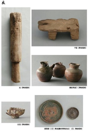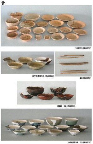 陶磁器では、瀬戸美濃焼皿、木製品も漆器椀・皿、箸が出土しています。また、貿易陶磁器では、中国産の青磁碗・皿、白磁皿、青花碗・皿があります。