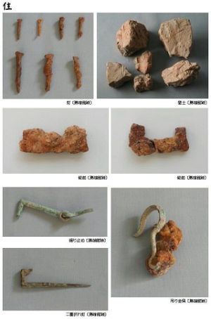 また、錠前の出土もあり、建物の性格を考える上で貴重な資料といえるでしょう。さらには、煽り止めや二重折れ釘、吊り金具、様々な飾り金具が出土しており、建具や内装、そこに使われていた調度品にまでその想像の世界は広がります。