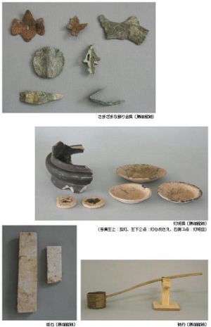さらに、化粧道具としては歯黒壺と考えられる雀口、銅製の鏡や紅皿の出土がありました。