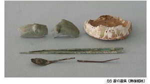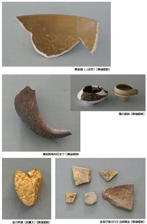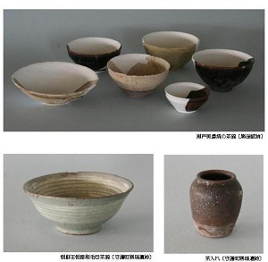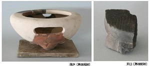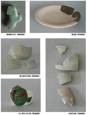 勝瑞ではいろいろな国産、外国産の陶磁器が出土しています。 天目茶碗、茶入れなどの茶道具、香道具や床飾りなども多く出土しています。 お茶・お香・お花は当時の武士にとっての重要なたしなみのひとつでした。 床飾りの青磁の盤は1200~1300年代のもので、当時でも骨董品であり、このようなものを飾ることはステータスでした。